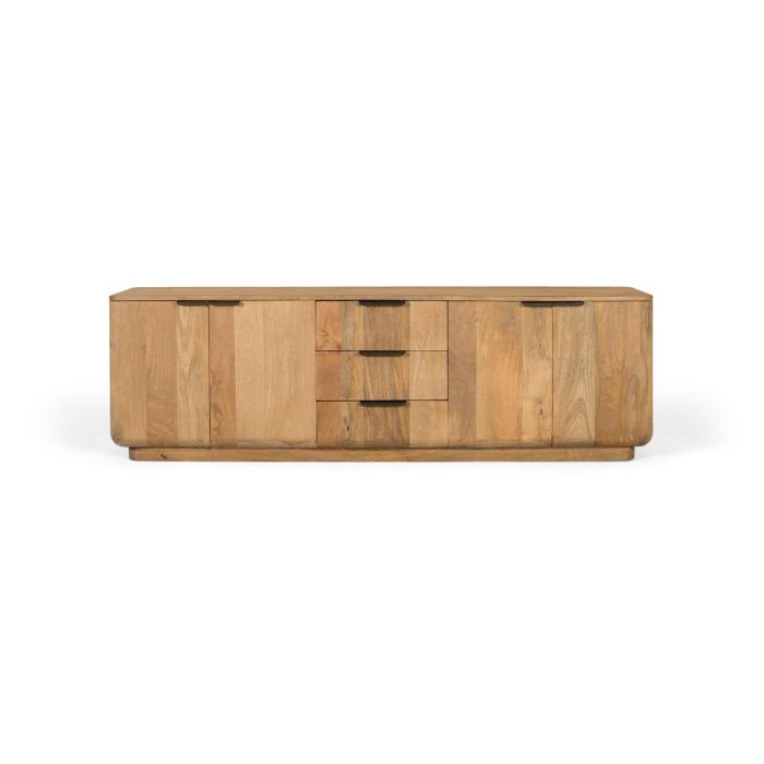 Meuble TV en bois de manguier de couleur naturelle, conçu avec des lignes épurées et des coins arrondis qui mettent en valeur son style moderne et chaleureux. Il dispose de quatre portes spacieuses et trois tiroirs centraux, tous équipés de poignées métalliques qui apportent un contraste élégant et fonctionnel.