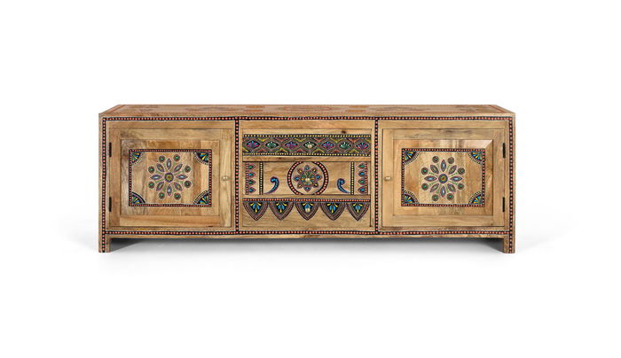 GINER Y COLOMER Meuble TV 150 cm en Bois de Mango Massif Fait Main avec 3 Tiroirs et 2 Portes, Détails Peints à la Main, Style Artisanal