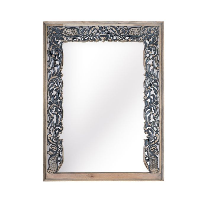 Ce miroir est encadré de bois de manguier sculpté à la main. Son fini bicolore associe des tons naturels et un bleu vieilli. Les sculptures, réalisées avec un grand souci du détail, confèrent à ce miroir un style classique aux influences ethniques, idéal pour des ambiances bohèmes, rustiques ou coloniales.