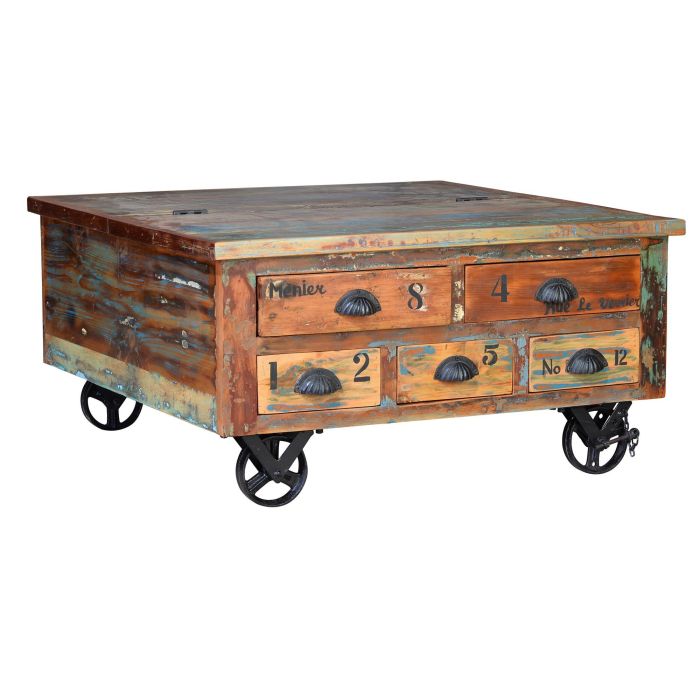 GINER Y COLOMER - Table basse en bois recyclé multicolore avec 5 tiroirs et roulettes - 90 x 90 x 40 cm