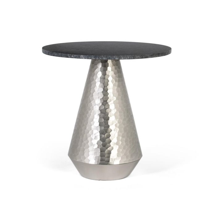 La base, fabriquée en aluminium, adopte une forme conique qui lui assure une grande stabilité et un design imposant. Sa surface a été martelée à la main, créant une texture irrégulière qui rehausse son aspect artisanal et ajoute un attrayant jeu d'ombres et de lumières.
