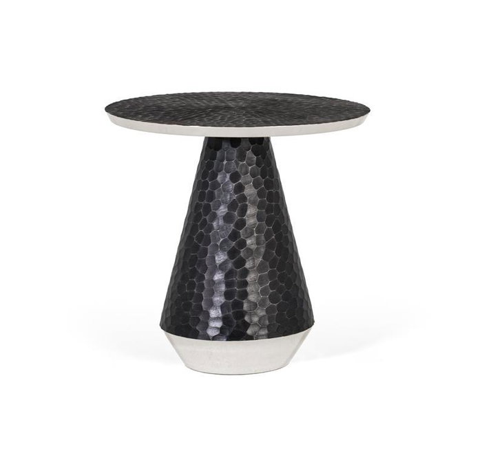 Table basse ronde entièrement fabriquée en aluminium. Le plateau et le socle présentent une finition gris foncé, décorée d'un effet martelé qui ajoute de la profondeur et un caractère artisanal à la pièce. Comme détail distinctif, la bordure du plateau contraste avec une finition lisse en métal argenté, apportant une touche de sophistication et de modernité.