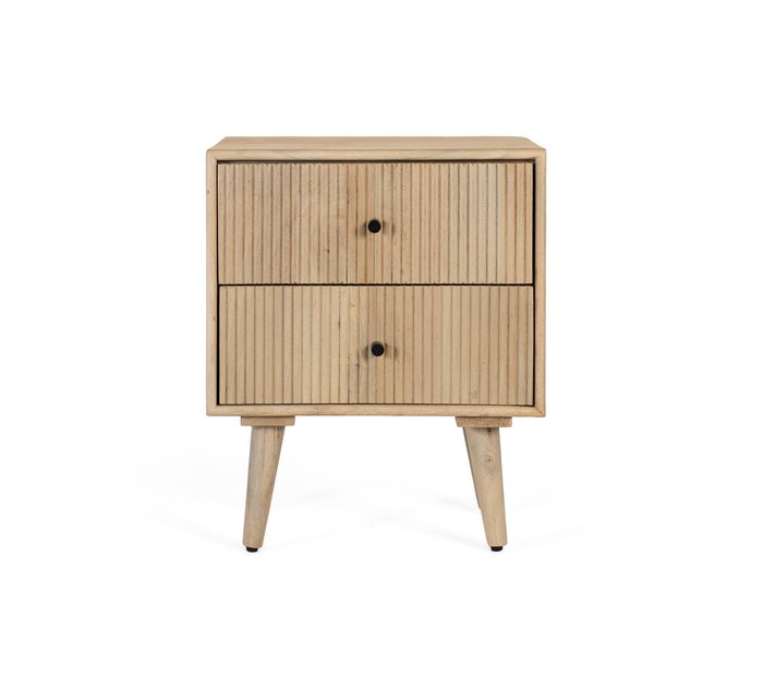 Cette petite table est fabriquée en bois massif de manguier, un matériau résistant et d'une grande beauté naturelle. Elle présente une finition dans un ton clair naturel. Le design se distingue par le devant des tiroirs à texture cannelée. Elle dispose de deux tiroirs spacieux, chacun avec une poignée ronde métallique de couleur noire, qui ajoute un contraste subtil et une touche contemporaine. Les pieds coniques en bois complètent sa structure, apportant stabilité et une allure légère, caractéristique du style nordique ou scandinave.