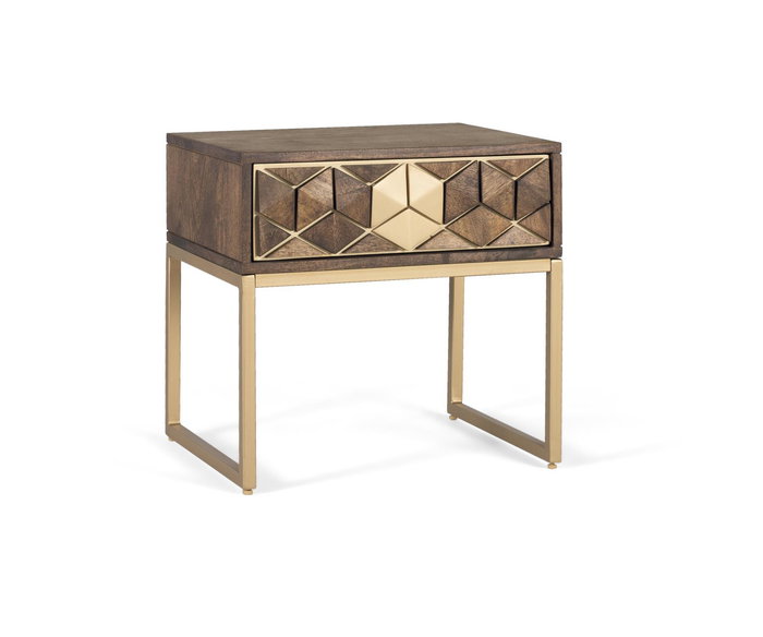 Table de chevet GINER Y COLOMER à un tiroir, alliant élégance et fonctionnalité. Fabriquée à partir de bois de manguier massif, cette pièce arbore une belle finition couleur noyer. La structure intègre une base métallique aux accents dorés, apportant une touche moderne et raffinée à votre chambre.