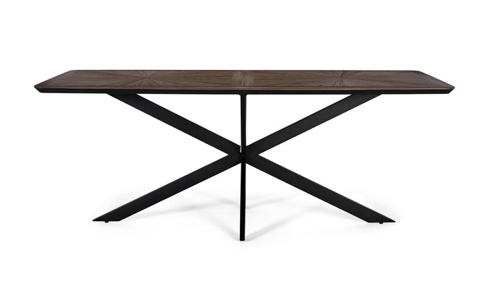 La table de salle à manger est conçue avec un plateau rectangulaire fabriqué en bois de teck recyclé. Le plateau présente un motif élaboré de marqueterie avec un dessin radial en quadrants, créant ainsi un effet visuel symétrique. La base est composée d'un jeu de pieds en fer entrecroisés en forme de "X", peints en noir mat. Grâce à sa conception robuste, cette table est idéale pour les salles à manger spacieuses ou les espaces ouverts souhaitant allier fonctionnalité et esthétique contemporaine.