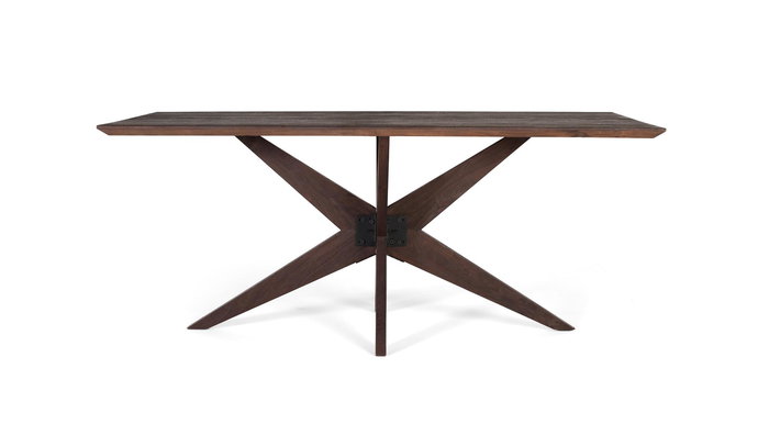 Cette table de salle à manger rectangulaire allie l'élégance contemporaine et la robustesse des matériaux naturels. Le plateau est fabriqué en bois de manguier, avec un fini dans un ton wengué foncé qui apporte sophistication et chaleur à l'intérieur. Le piètement, quant à lui, est réalisé en fer peint en noir, formant une structure sculpturale aux pieds croisés en forme d'étoile ou d'araignée. L'association de ces matériaux crée une pièce à la fois remarquable et fonctionnelle, parfaite pour les salles à manger de style contemporain et industriel.