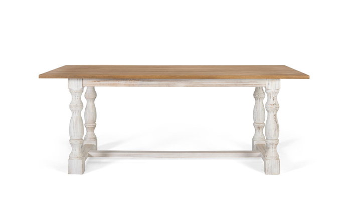 Cette table à manger rectangulaire est fabriquée en bois de manguier. Le plateau présente une finition couleur naturel qui met en valeur les caractéristiques uniques du bois. Les pieds de la table, tournés avec précision, sont finis dans un élégant blanc vieilli, avec un effet usé qui apporte une touche rustique et vintage. La combinaison du plateau aux tons bois et des pieds blancs vieillis équilibre le style rustique avec une esthétique raffinée et polyvalente.