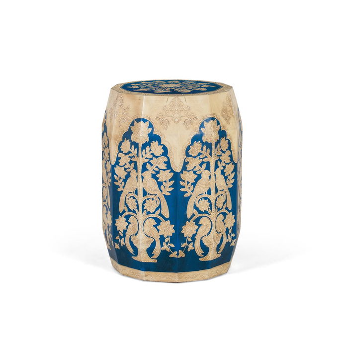 Ce tabouret au look robuste est fabriqué en bois de manguier. Il est décoré et peint à la main avec d'exquis motifs floraux d'inspiration ethnique dans des tonalités bleues.