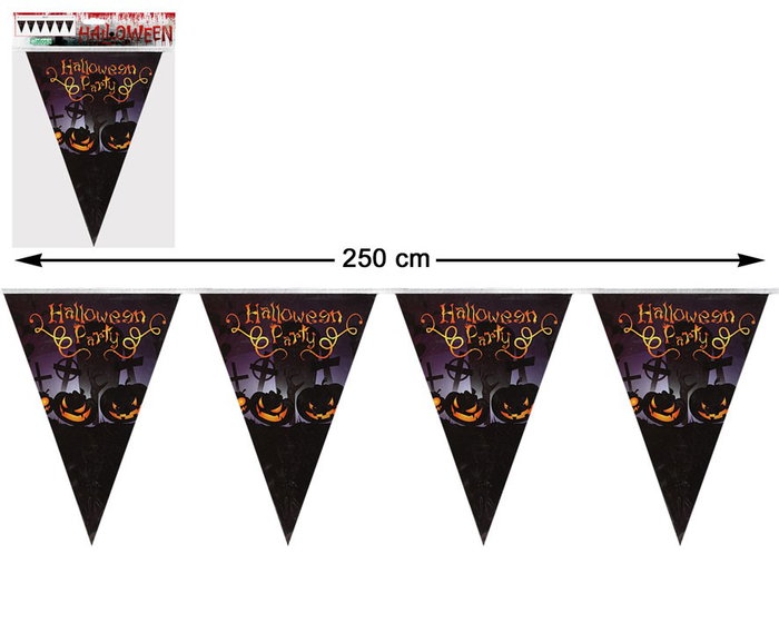 Découvrez notre guirlande Halloween pour décorer votre maison. Son design original impressionnera tous vos invités. Le fond représente un champ de citrouilles et le slogan 'Halloween Party' invite à rejoindre la fête. Sa grande taille (250 centimètres de long) la rend parfaite pour décorer n'importe quelle pièce ou salon.