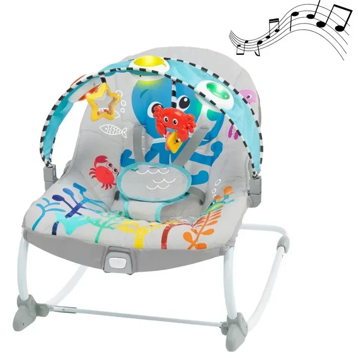 - Informations complémentaires: Évolutif.Jusqu'à 18 kg.Siège aux matières ultra douces et au rembourrage moelleux.Position fixe ou à bascule.Avec arche jouet.Fonction:musical et vibration-25 mélodies.Apport éducatif:développement de la motricité,apprentissage de la méthode cause et effet,éveil sensoriel.Précautions d'emploi:ne pas utiliser ce produit si votre enfant peut tenir assis tout seul ou s’il pèse plus de 9 kg
