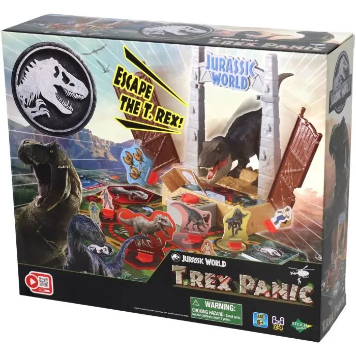 Dans Jurassic World T-Rex Escape, lancez le dé et avancez sur le plateau. Évitez la zone périlleuse où un T-Rex peut vous renvoyer au départ! Tirez des cartes a chaque tour et accumulez des points pour gagner. Un jeu d'action et de réflexe pour toute la famille, a partir de 5 ans.