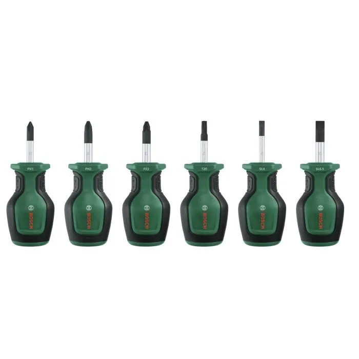 Ce set de 6 tournevis courts de la marque Bosch est idéal pour les endroits restreints. Comprenant des embouts PH, PZ, TX et Plat, ces tournevis en acier S2 offrent un couple élevé pour un travail efficace. Parfait pour les professionnels et les bricoleurs.