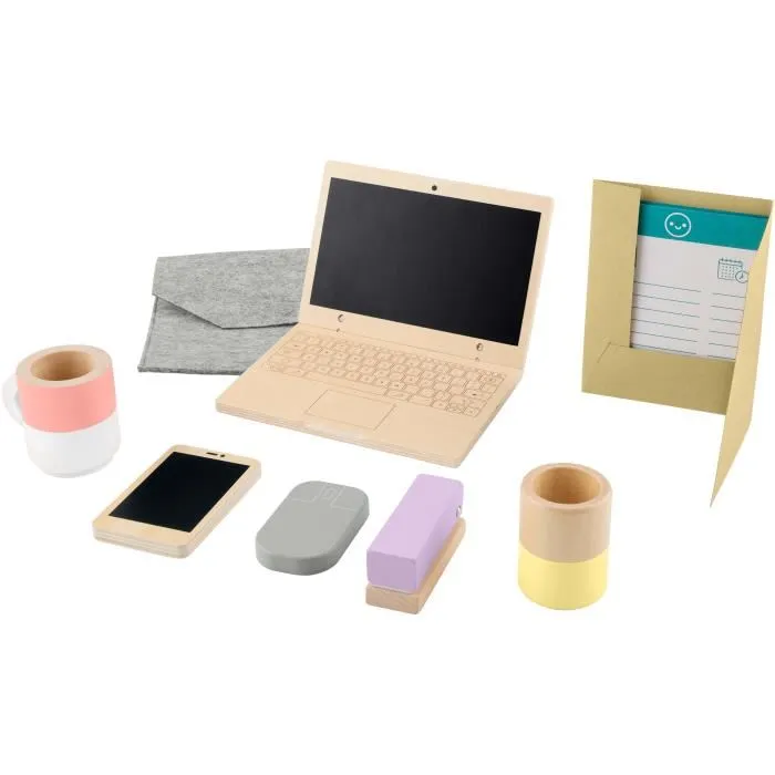 Découvrez le set de télétravail en bois FISHER-PRICE HXV11, comprenant 11 pieces essentielles pour le jeu de rôle : ordinateur, téléphone, souris, mug, et plus. Idéal pour stimuler l'imagination des enfants a partir de 3 ans.