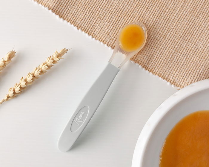 KioKids Cuchara Cuillère Bébé en Silicone Gris Step 2, pour Enfants de +4 Mois, Mangeoire Douce et Résistante Lavable au Lave-Vaisselle