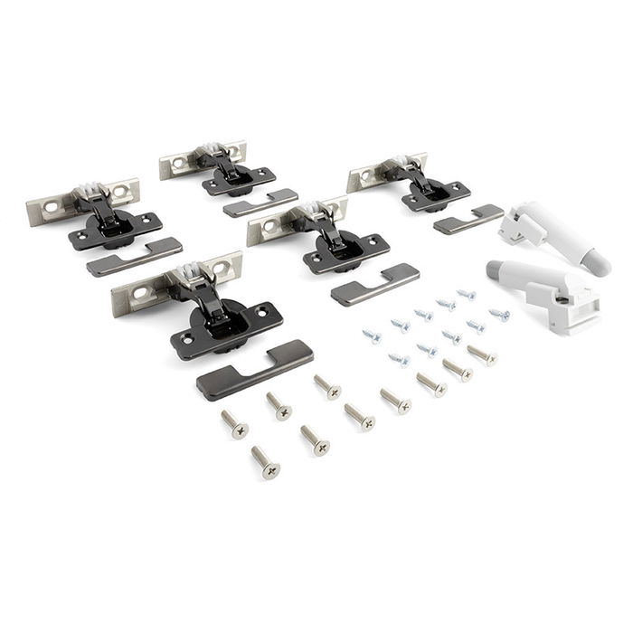 Les kits de référence 705.341 à 705.344 font partie du système Exedra pour portes escamotables et pliantes. Ils incluent le mécanisme d'ouverture selon la configuration : Push (ouverture par pression sans poignée) ou Smove (ouverture avec fermeture amortie). Disponibles en finition nickel ou titane, ces kits garantissent une ouverture douce, silencieuse et discrète, idéale pour les armoires et les solutions de mobilier intégré.