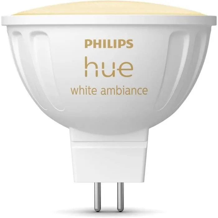 Avec les nouvelles ampoules intelligentes MR16, vous pouvez faire entrer les lumieres intelligentes Philips Hue dans tous les coins de votre maison. Leur conception a deux broches de 12 volts s'adapte parfaitement a la plupart des luminaires existants, ce qui vous permet de mettre a niveau vos ampoules conventionnelles sans remplacer le transformateur. Les ampoules Philips Hue MR16 offrent une gamme de lumiere blanche chaude a froide et sont aussi lumineuses qu'une ampoule halogene de 35 W. Les ampoules intelligentes MR16 White Ambiance vous offrent des milliers de nuances de lumiere blanche a utiliser tout au long de la journée, de la lumiere froide le matin aux tons chauds le soir. C'est le moyen le plus simple de remplacer les ampoules MR16 classiques et de les rendre intelligentes. Utilisez-les avec un pont Philips Hue pour accéder a l'ensemble des fonctions d'éclairage intelligent, y compris les automatismes et le contrôle a distance. Un systeme d'éclairage intelligent Philips Hue vous permet d'obtenir un éclairage intelligent a l'intérieur et a l'extérieur de votre maison, a partir de l'application, de votre voix ou d'accessoires intelligents.