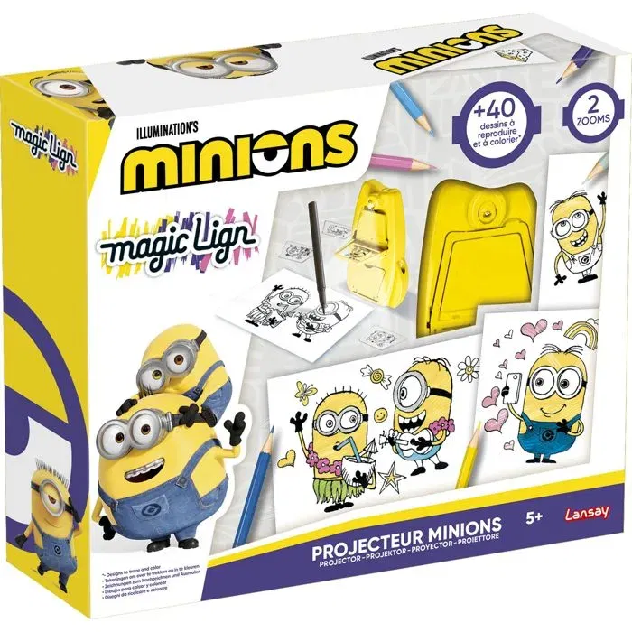 Avec le Magic Lign Projecteur Minions, amuse-toi a reproduire tes personnages préférés ! Dessine facilement les Minions les plus drôles et crée des scenes completement rigolotes ! Plus de 40 illustrations a reproduire. Son format compact te permet de l'emporter partout, et tu peux meme ranger les films transparents dans le projecteur pour ne rien oublier !