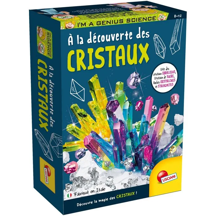 I'M A GENIUS POCKET DECOUVERTE DES CRISTAUX, Un kit scientifique pour créer comme par magie de nombreux types de cristaux, facilement et en toute sécurité. Avec le matériel fourni, tu pourras créer des stalagmites, des roches cristallines, des cristaux de sucre et meme des coraux cristallins ! De plus, tu apprendras également le fonctionnement du phénomene de cristallisation dans la nature. . 8-12 ans- Fabriqué en Italie