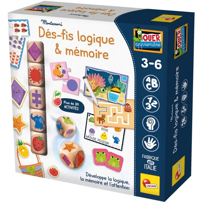 DÉS-FIS LOGIQUES & MÉMOIRE Jeux éducatifs préscolaires - Jouer-Apprendre - Fabriqué en Italie - Un jeu éducatif conçu pour les enfants de 3 a 6 ans, permettant de découvrir les nombres, les mots et les formes géométriques de maniere simple et ludique. Il développe la logique, la mémoire et l'attention. Le jeu comprend plus de 36 activités et inclut : 5 dés éducatifs en bois : 1 dé formes, 1 dé couleurs, 1 dé activités, 1 dé images, 1 dé animaux, 12 cartes mémo et 6 associations d'animaux, 16 cartes d'activités avec feutre effaçable, 8 formes géométriques, 8 formes de fruits et 8 formes de légumes Un puzzle des nombres, Un plateau en forme de panier.Selon l'activité choisie, les dés sont utilisés seuls ou combinés entre eux, offrant de nombreuses possibilités de jeux et d'apprentissage. Parmi elles, l'écriture grâce au feutre effaçable : l'enfant peut écrire et effacer autant de fois qu'il le souhaite. 3 - 6 ans