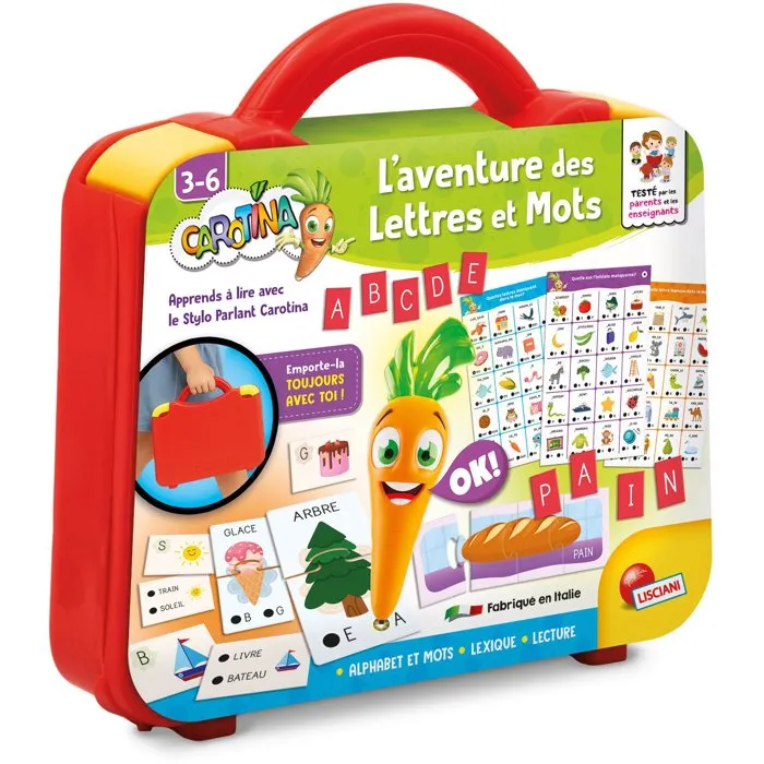 Liscianigiochi Stylo Parlant CAROTINA - Valisette Aventure des Lettres et Mots - Bureau Portable Alphabet & Quiz - Jeu Éducatif pour Enfants de 3 à 6 Ans