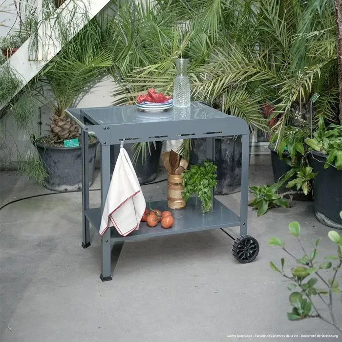 Livoo Desserte GS168G pour Plancha - Structure Acier, 2 Roues Crantées, Plateaux 70 x 50 cm et 79 x 49 cm, Panier de Rangement Inclus