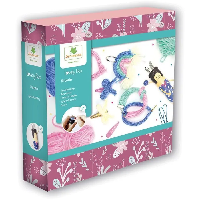 Une jolie box pour apprendre le tricotin et réaliser facilement des décorations et accessoires en laine. Une activité calme et créative parfaite pour débuter des 7 ans.