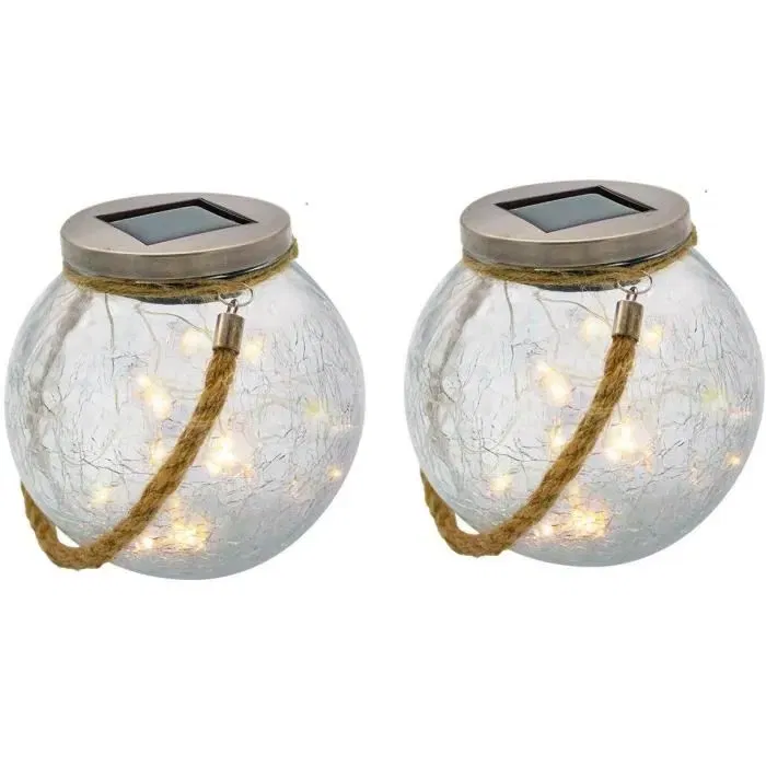 - Description du produit: LAMPE DE TABLE SOLAIRE LED : 2x Crack Ball Cord est un lot de 2 boules solaires à base micro LED blanc chaud qui possède jusqu'à 6 heures d'autonomie de fonctionnement Designs et originales elles apporteront une touche tendance à votre décoration avec leur poignée en corde Le lot de lampes solaires en verre craquelé 2x Crack Ball Cord, est idéal comme lampe de table design, lampe de chevet ou veilleuse pour enfant ou encore pour éclairer tous vos mariages, anniversaires et autres réceptions A vous de choisir UTILISATION EXTERIEUR / INTERIEUR : après une charge solaire rapide de vos lampes 2x Crack Ball Cord, vous pourrez utiliser ces luminaires designs partout, à l'extérieur comme dans la maison Que ce soit comme lampe d'extérieur pour le jardin, comme lampe de table pour le salon, ou simplement comme lampe déco pour une chambre, le lot de lampe solaires 2x Crack Ball Cord s'adapte à toutes les situations AUTONOMIE : le lot de lampes de table solaires 2x Crack Ball Cord, une fois chargé à son maximum, peut éclairer tout autour de vous pendant près de 6 heures Le temps de charge complet des bocaux est de 4-6 heures INTENSITE : le lot de boules solaires 2x Crack Ball Cord possède une luminosité blanc chaud qui apportera à votre espace une atmosphère douce et chaleureuse Ces lampes solaires sont un bel éclairage d'ambiance avec leur flux lumineux de moins de 100 Lumens PRATIQUE, ROBUSTE & TENDANCE : l'éclairage extérieur solaire 2x Crack Ball Cord, protégé contre les éclaboussures (IP44) et résistant aussi aux UV, fait une hauteur totale de 13 cm (poignée comprise) et de diamètre 11 cm Le lot de lampes solaires 2x Crack Ball Cord se nettoie facilement avec de l'eau tiède et du savon doux
