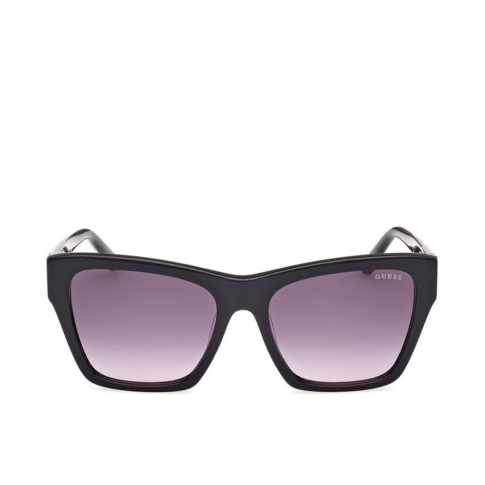 Lunettes de soleil GUESS pour femme au style carré, idéales pour un look moderne et élégant. La monture est en plastique brillant de couleur noir et les verres sont en gris fumé dégradé pour une protection optimale contre l'éblouissement.