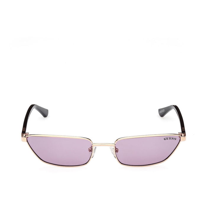 Lunettes de soleil GU8285 28Y de Guess. Lunettes de soleil femme à la forme cat-eye. Monture en métal brillant couleur rose doré et verres couleur violet. Largeur du pont de 18 mm, diamètre du verre de 57 mm et longueur de la branche de 135 mm.