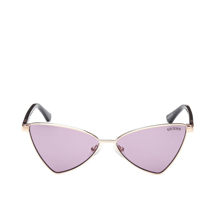 Lunettes de soleil GUESS pour femme à la forme géométrique moderne. La monture est en métal de couleur or rose brillant, avec des verres teintés violet. Les dimensions sont les suivantes : largeur du pont de 13 mm, diamètre du verre de 55 mm et longueur des branches de 135 mm.