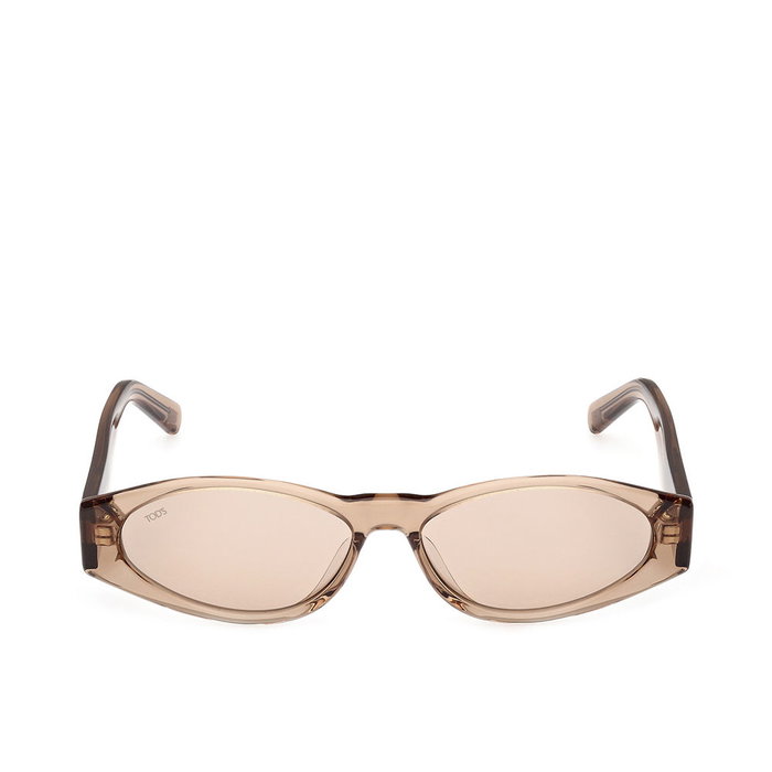 Lunettes de soleil TO0362-H 45E de TOD'S. Lunettes de soleil femme à la forme ovale. Monture en plastique de couleur marron clair brillant et verres teintés marron. Largeur de pont de 15 mm, diamètre du verre de 57 mm et longueur de branche de 140 mm.