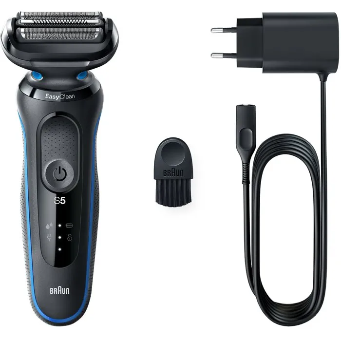 - Description du produit: Le rasoir électrique Braun Series 5 est efficace même sur les barbes les plus dures. Grâce à la technologie AutoSense, il adapte la puissance à la densité de votre barbe pour un rasage optimal. Sa couleur noire et bleue ajoute une touche de style à votre routine.