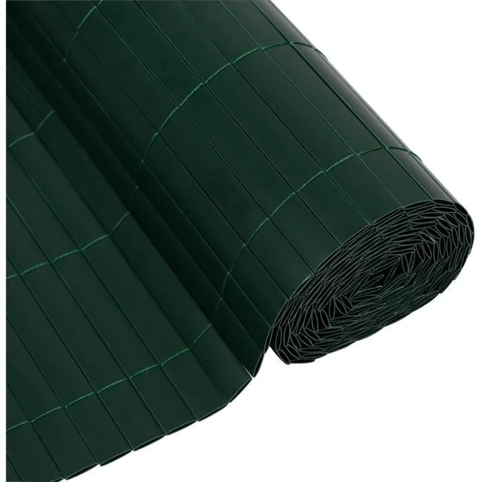 - Composition du lot: Canisse PVC double face, densité 1600 g/m² recyclé à 50%, traitée anti-UV, largeur des lames 19 mm, profilé oblong monobloc, assemblage par fil polyester recyclable tous les 10 cm sur la hauteur. Elle offre un fort degré d'occultation (4/5) pour une utilisation balcon, terrasse ou jardin. Vert - 1x3m