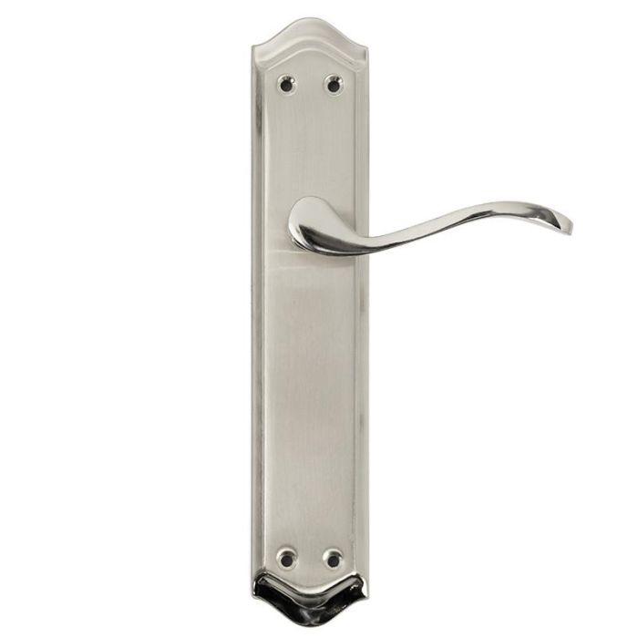 Manilla de zamak en acabado níquel satinado de la marca de manillas, manillones y rosetas Jandel. Esta manilla en níquel tiene un alto de 256 mm y un ancho de 49 mm.