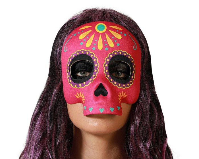 Célébrez le jour des morts avec ce masque de crâne coloré en rose, orné de fleurs et de détails décoratifs dans des tons vifs. Il évoque la tradition mexicaine avec une touche festive et élégante. Il est parfait pour les déguisements de Catrina, les fêtes à thème ou les événements culturels. Il apporte un style joyeux et symbolique à votre look.