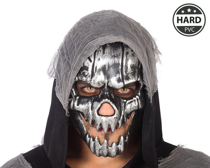 Masque de Squelette Argenté en PVC avec Capuche Noire pour Homme Adulte - Déguisement Halloween Cosplay
