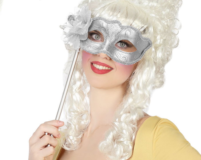 Masque vénitien élégant avec tige, fleur décorative et reliefs argentés