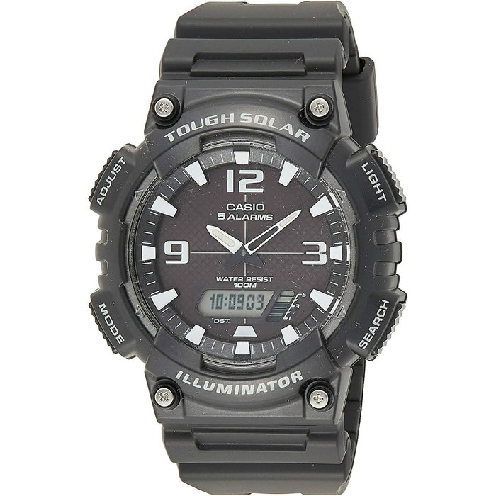 Le Casio AQ-S810W1AVEF est une montre pour homme qui allie fonctionnalité et robustesse dans un design discret et pratique. Son boîtier et son bracelet sont en résine noire, un matériau léger et résistant, idéal pour un usage quotidien confortable, parfait pour ceux qui recherchent un accessoire solide et peu exigeant en entretien. Le cadran noir offre une lecture claire et simple, complétée par des caractéristiques typiques de la collection Casio Collection, destinée aux utilisateurs appréciant la fiabilité classique. Ce modèle fait partie d’une gamme de montres solaires, ce qui signifie qu’il se recharge à la lumière naturelle ou artificielle, optimisant ainsi l’autonomie et réduisant la fréquence de changement de pile. Son design sobre et fonctionnel s’adapte aussi bien aux environnements décontractés que sportifs, offrant polyvalence sans sacrifier une esthétique élégante et minimaliste. En résumé, le Casio AQ-S810W1AVEF est une option pratique et durable pour l’homme moderne cherchant une montre fonctionnelle, légère et conçue avec des matériaux garantissant une longue durée de vie.