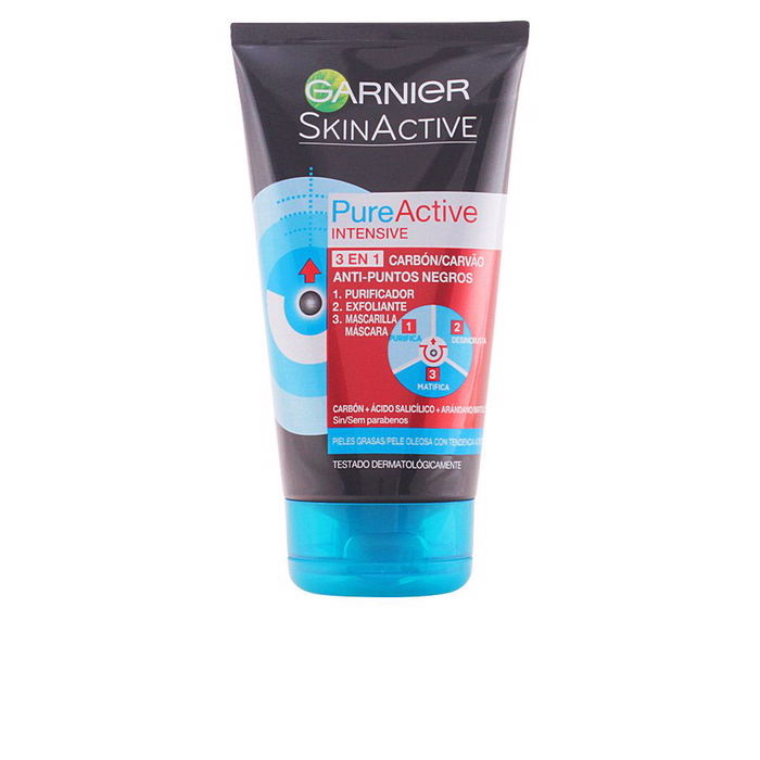 Garnier Pure Active Intensif 3 en 1 Charbon Anti-Points Noirs pour Peaux Grasses Soin Purifiant Nettoyant Gommage Masque 150 ml