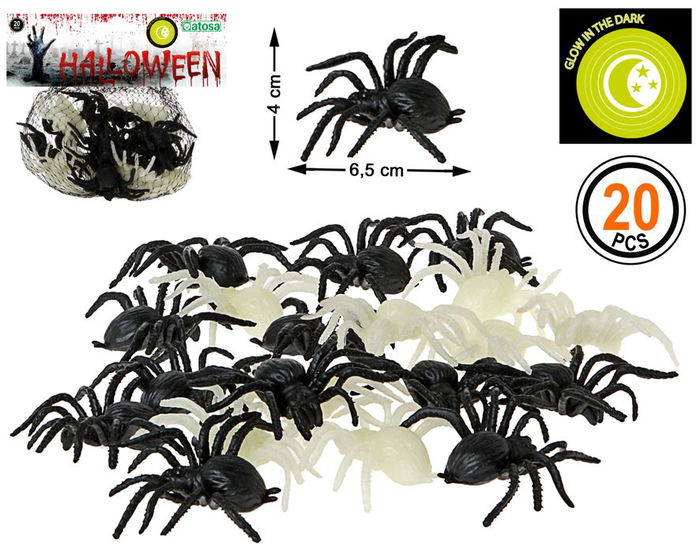 Pack de 20 araignées décoratives brillant dans le noir - Accessoire pour fête d'Halloween - Couleur noire