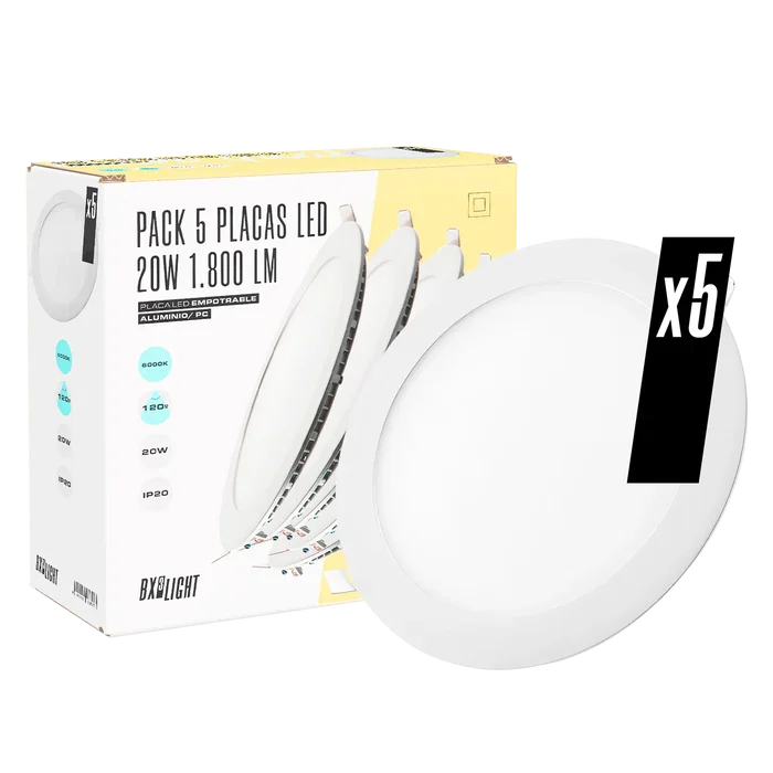 Le Pack de 5 Plafonniers LED 20W 6000K de BX3 Light procure un éclairage clair et brillant, idéal pour les espaces nécessitant une meilleure perception visuelle et une sensation d'amplitude, tout en maintenant une consommation d'énergie réduite et une longue durabilité.
