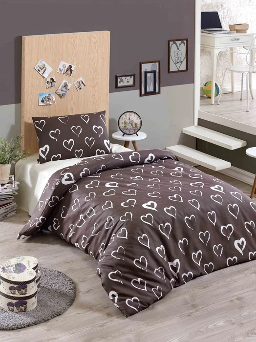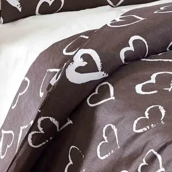 Parure de lit 1 personne - Housse de couette 140 x 200 cm imprimé coeur brun + 1 taie d'oreiller 60 x 60 cm