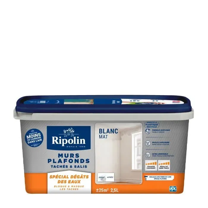 Ripolin - Peinture mur et plafond intérieur mate ultra couvrante - Recouvre les taches et dégâts des eaux - Blanc - 2,5 litres