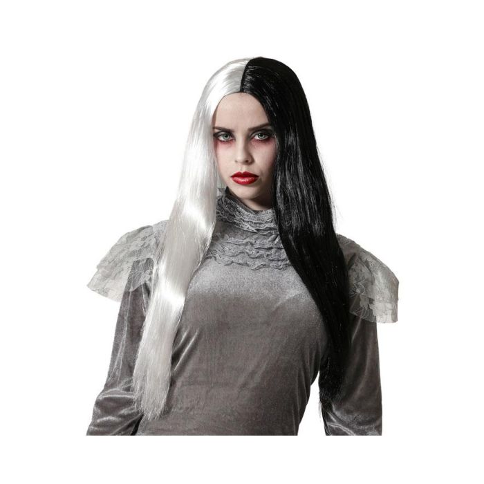 Peluca Larga Bicolore Blanc et Noir 60 cm avec Rage Centrale - Perruque Longue Droite pour Théâtre, Gothique, Cosplay, Halloween, Carnaval