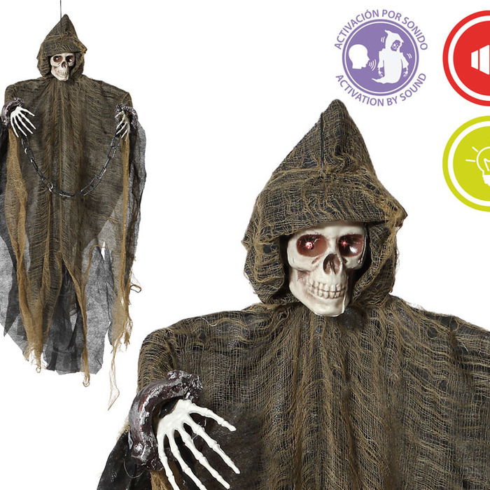 Décor Halloween Squelette Suspendu Capuche Marron 89 cm Lumière et Son - Décoration Effrayante pour Porte ou Coin Somb