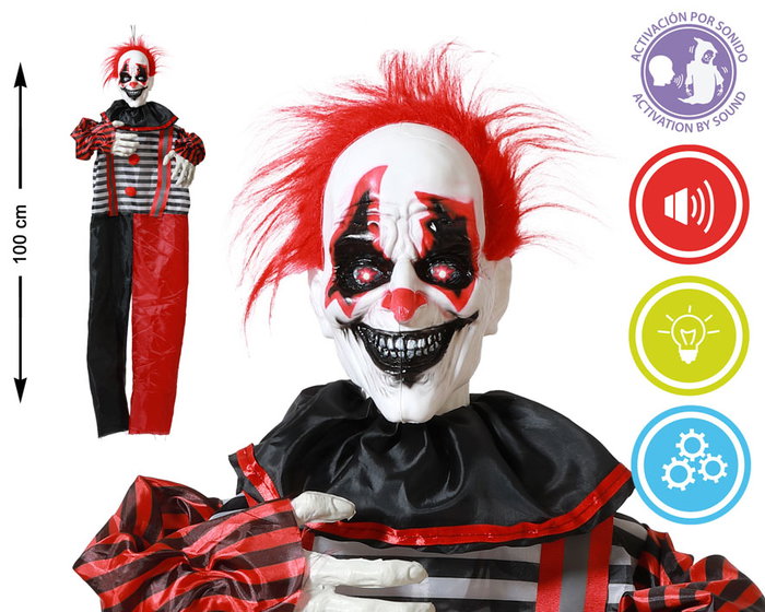 Payaso Colgante avec Cheveux Rouges et Costume à Rayures 100 cm avec Lumière et Son - Décor Halloween Sinistre