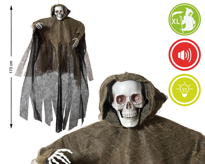 Calavera Decorativa Colgante Avec Capuche Marron 173 cm Avec Lumière et Son, Décoration Effrayante pour Halloween et Maison Hantée