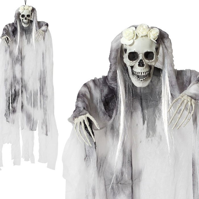Apportez une touche fantomatique avec cette tête de mort suspendue de 120 cm. Ses détails soignés et sa crinière blanche créent une figure inquiétante et élégante, parfaite pour des ambiances gothiques ou des scènes spectrales.