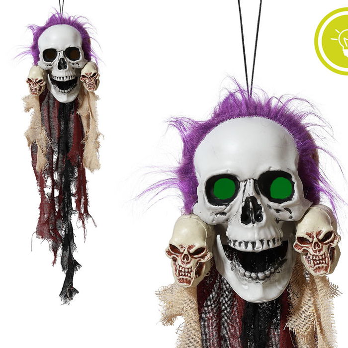 Pirate Skull Hanging Decor avec Yeux Lumineux, Cheveux Violets, 75 cm - Décoration Halloween et Thématique Macabre