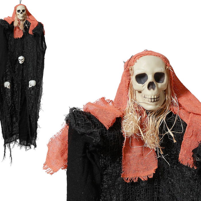 Squelette Suspendu avec Cape Noire et Foulard Rouge 95 cm Décoration Horreur Halloween - Accessoire Épouvantable pour Fête, Passage Secret ou Vitrine